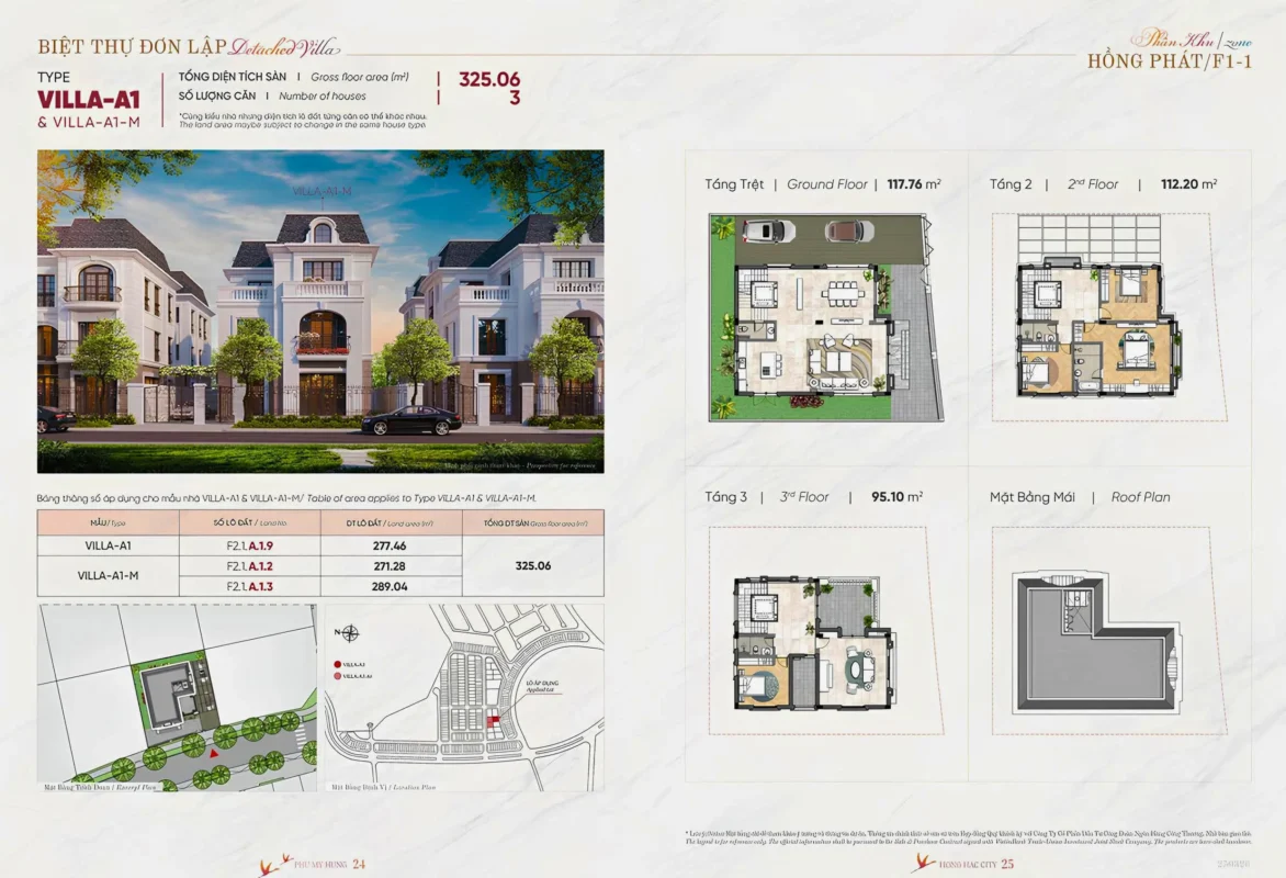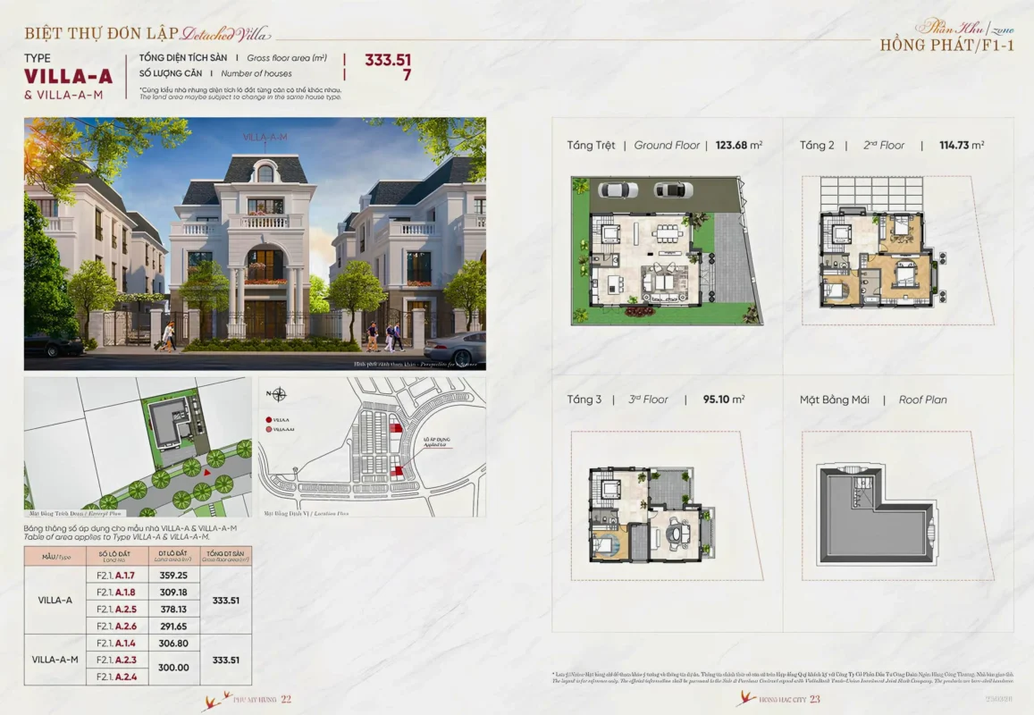 Biệt thự đơn lập: Diện tích từ 300-500 m²/căn.