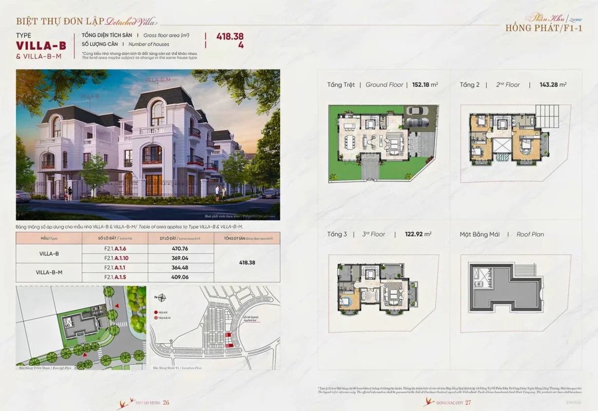 BIỆT THỰ ĐƠN LẬP (17 căn): diện tích 15×20, 15×23, 16×16, 16×20, 16×23, 20×14.5, 25×16 diện tích đất từ 290 – 470m, xây sẵn 3 tầng.