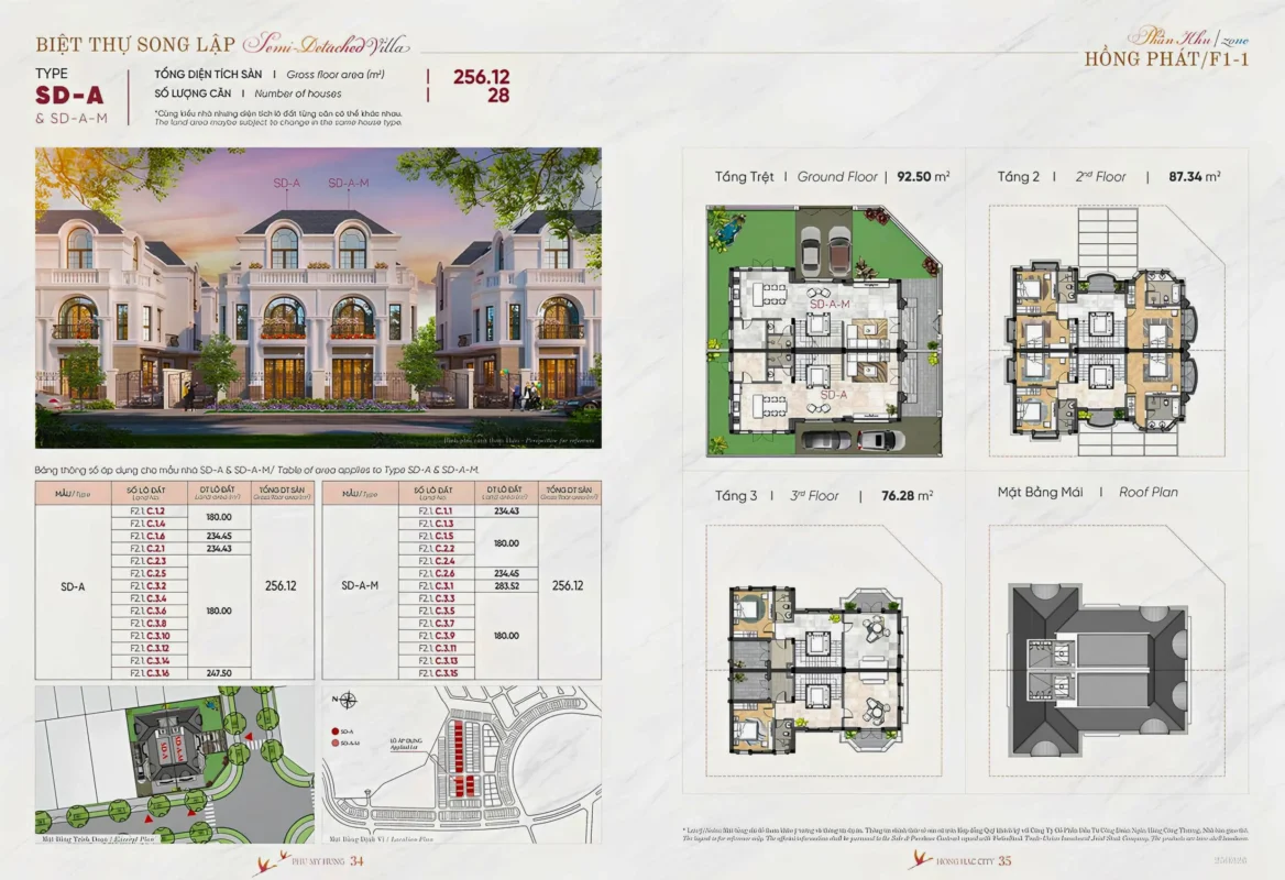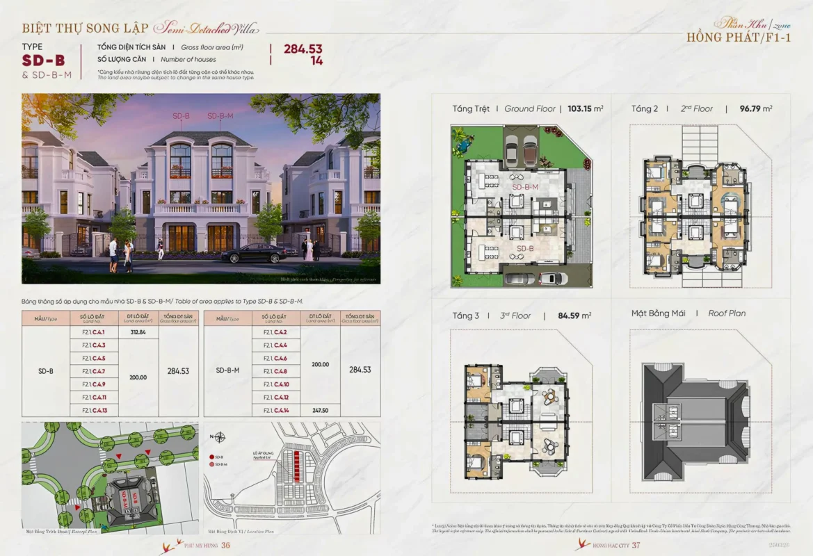 Biệt thự song lập: Diện tích từ 200-300 m²/căn.