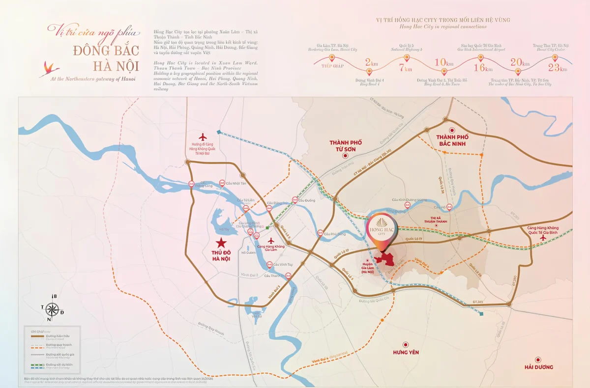 Dự án Hồng Hạc City tọa lạc trên địa bàn 3 xã Xuân Lâm, Ngũ Thái và Song Liễu, thuộc huyện Thuận Thành, tỉnh Bắc Ninh. Đây là khu vực nằm trong vùng tam giác kinh tế trọng điểm Hà Nội – Hải Phòng – Bắc Ninh, liền kề với Gia Lâm – Hà Nội, cách khu đô thị Vinhome Riverside 9km và gần các tuyến giao thông huyết mạch như Quốc lộ 5A, Quốc lộ 17, và đường Vành đai 4 đang thi công. Vị trí này không chỉ thuận tiện kết nối với Hà Nội mà còn gần các khu công nghiệp lớn như Samsung, VSIP.